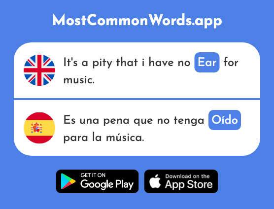 The Spanish word for Hearing, ear is Oído. It is the 1659th most commonly used word in Spanish, classified as a A2 word. It can be used as noun. This word often comes up when talking about body & health. You can listen to their pronunciations by clicking on the speaker icon, and you can also see example sentences for context below. Download our app to practice the 3000 most common Spanish words, including this one, with over 60,000 example sentences, pronunciations, and various practice types.
