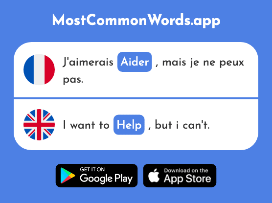 La traduction de Aider en Anglais est Help, assist. Il peut être utilisé comme verbe. Ce mot revient souvent quand on parle de coopération. Il est classé comme un mot A1 et est le 10e mot le plus courant en Anglais. Vous pouvez écouter leurs prononciations, et vous pouvez également voir des exemples de phrases pour le contexte ci-dessous. Téléchargez notre application pour pratiquer les 3000 mots Anglais les plus courants, y compris celui-ci, avec plus de 60 000 exemples de phrases, prononciations et divers types de pratique.