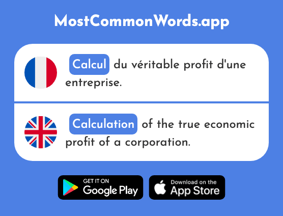 Le mot Anglais pour Calcul est Calculation. Il peut être utilisé comme nom. C'est le 10e mot le plus couramment utilisé en Anglais, classé comme un mot A2. Ce mot revient souvent quand on parle de chiffres & quantité. Appuyez sur l'icône du haut-parleur pour écouter leurs prononciations, et vous pouvez également voir des exemples de phrases pour le contexte ci-dessous. Découvrez tous les 3000 mots Anglais les plus courants avec plus de 60 000 exemples de phrases, prononciations et divers types de pratique en téléchargeant notre application aujourd'hui.
